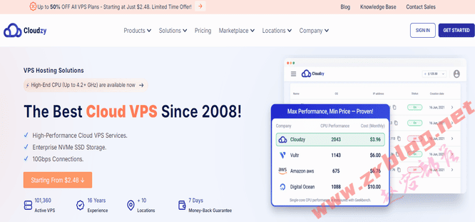 Cloudzy,今年初收购了BuyVM,商家成立于2008年,曾用名RouterHosting(赵容部落最早在2012年初分享过),商家提供云服务器(VPS)、独立服务器等产品,以Cloud VPS为例,可选择Regular CPU、High Frequency CPU、Premium GPU系列,下单最高自动5折,开设在美国洛杉矶、拉斯维加斯、犹他州、达拉斯、纽约、迈阿密、瑞士伯尔尼、荷兰阿姆斯特丹、英国伦敦、德国法兰克福、新加坡等机房,10Gbps端口,最低$2.48/月起,还支持按小时计费。