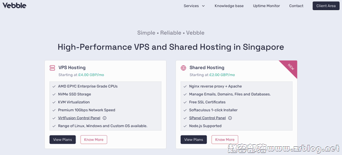 Vebble是2024年成立的国外主机商(好像是webhorizon旗下站),提供虚拟主机和VPS等产品,数据中心在新加坡,10Gbps端口,国际线路。商家现在有一个VPS五折促销优惠,适用于除2GB内存以外的全部套餐,节点采用AMD EPYC 7003 CPU,NVMe SSD组RAID10,折后4GB内存套餐低至月付4英镑起,支持使用PayPal或者信用卡付款。