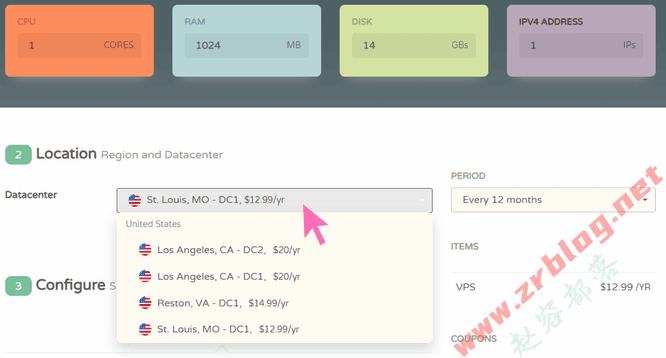 下单注意选4个Datacenter,圣路易斯最低价、雷斯顿次之,洛杉矶最高,下表价格以圣路易斯为例。