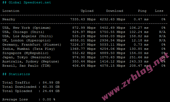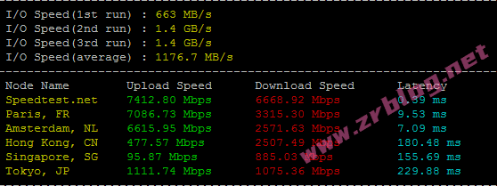 bench一键包磁盘IO和带宽信息,I/O大概在1176MB/s的样子,vultr所有云服务器带宽端口都很给力。