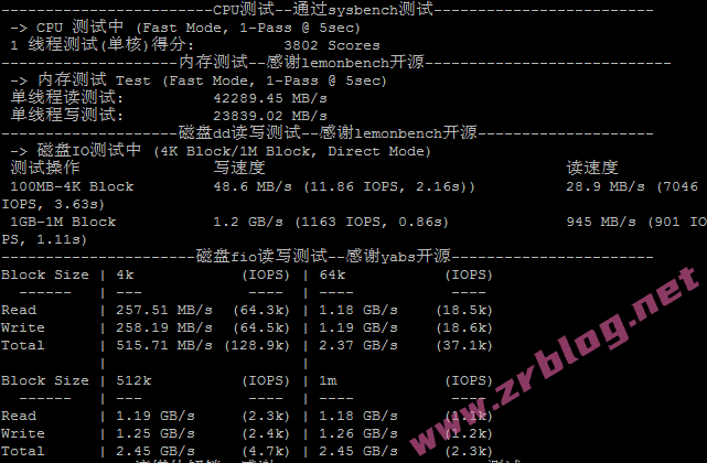 CPU跑分、内存和磁盘dd/fio读写测试结果: