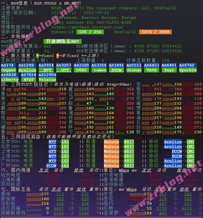 三网回程路由(线路可能随网络负载动态变化) 北京 电信 NTT -> 163 地理路径:德国 -> 北京 自治系统路径:AS2914 -> AS4134 -> AS4847 1 0.20ms 169.254.*.* * RFC3927 2 0.37ms 100.100.*.* * RFC6598 3-4 1.13ms 10.75.*.* * RFC1918 5 0.49ms 212.119.*.* AS2914 德国 黑森 美因河畔法兰克福 gin.ntt.net 6-7 1.05ms 129.250.*.* AS2914 [NTT-BACKBONE] 德国 黑森 美因河畔法兰克福 gin.ntt.net 8 2.32ms 81.173.*.* AS4134 德国 chinatelecom.com.cn 9-11 138.39ms 202.97.*.* AS4134 [CHINANET-BB] 中国 北京 chinatelecom.com.cn 电信 12 159.45ms 36.112.*.* AS4847 中国 北京 bj.189.cn 13 161.94ms 219.141.*.* AS4847 [CHINATELECOM-BJ] 中国 北京 bj.189.cn 14 142.75ms 219.141.*.* AS4847 [CHINATELECOM-BJ] 中国 北京 bj.189.cn 北京 联通 Unknown -> 4837 地理路径:北京 自治系统路径:AS4837 -> AS4808 1 0.21ms 169.254.*.* * RFC3927 2 0.39ms 100.100.*.* * RFC6598 3-5 1.24ms 10.75.*.* * RFC1918 6-9 142.74ms 219.158.*.* AS4837 [CU169-BACKBONE] 中国 北京 X-I chinaunicom.cn 联通 10-11 185.48ms 61.149.*.* AS4808 [UNICOM-CN] 中国 北京 北京 www.bbn.com.cn 15 155.54ms 123.125.*.* AS4808 [UNICOM-BJ] 中国 北京市 www.bbn.com.cn 联通 北京 移动 Arelion -> CMI 地理路径:德国 -> 瑞典 -> 美国 -> 北京 自治系统路径:AS1299 -> AS58453 -> AS9808 -> AS56048 -> AS9808 -> AS56048 1 0.26ms 169.254.*.* * RFC3927 2 0.51ms 100.100.*.* * RFC6598 3-4 1.25ms 10.75.*.* * RFC1918 5-7 1.40ms 62.115.*.* AS1299 [ARELION-NET] 德国 黑森州 美因河畔法兰克福 arelion.com 8 86.41ms 62.115.*.* AS1299 [ARELION-NET] 瑞典 斯德哥尔摩省 斯德哥尔摩 arelion.com 9 145.14ms 62.115.*.* AS1299 [ARELION-NET] 美国 加利福尼亚 洛杉矶 arelion.com 10 149.97ms 62.115.*.* AS1299 [ARELION-NET] 美国 佐治亚 亚历山大 arelion.com 12 151.53ms 62.115.*.* AS1299 [ARELION-NET] 美国 德克萨斯 达拉斯 arelion.com 14-16 152.14ms 223.120.*.* AS58453 [CMI-INT] 美国 加利福尼亚 洛杉矶 cmi.chinamobile.com 移动 17-19 316.71ms 221.183.*.* AS9808 [CMNET] 中国 北京 X-I chinamobileltd.com 移动 20 315.68ms 211.136.*.* AS56048 [CMNET] 中国 北京 bj.10086.cn 移动 24 321.61ms 211.136.*.* AS56048 [CMNET] 中国 北京 bj.10086.cn 移动 上海 电信 NTT -> 163 地理路径:德国 -> 上海 自治系统路径:AS2914 -> AS3491 -> AS2914 -> AS4134 -> AS4812 1 0.24ms 169.254.*.* * RFC3927 2 0.36ms 100.100.*.* * RFC6598 3-4 1.12ms 10.75.*.* * RFC1918 5 7.14ms 212.119.*.* AS2914 德国 黑森 美因河畔法兰克福 gin.ntt.net 6 0.91ms 63.218.*.* AS3491 [PCCW-BACKBONE] 德国 黑森 美因河畔法兰克福 pccwglobal.com 7 8.59ms 129.250.*.* AS2914 [NTT-BACKBONE] 德国 黑森 美因河畔法兰克福 gin.ntt.net 8 1.38ms 81.173.*.* AS4134 德国 chinatelecom.com.cn 9-10 166.18ms 202.97.*.* AS4134 [CHINANET-BB] 中国 上海 X-I chinatelecom.com.cn 电信 11-13 175.84ms 101.95.*.* AS4812 [CHINANET-SH] 中国 上海 chinatelecom.cn 电信 17 175.98ms 101.226.*.* AS4812 [CHINANET-SH] 中国 上海市 chinatelecom.cn 电信 上海 联通 Unknown -> 4837 地理路径:德国 -> 北京 -> 上海 自治系统路径:AS4837 -> AS140979 1 0.39ms 169.254.*.* * RFC3927 2 0.49ms 100.100.*.* * RFC6598 3-5 1.29ms 10.75.*.* * RFC1918 6 0.87ms 80.81.*.* AS4837 [DE-CIX] 德国 黑森 DE-CIX Frankfurt - China Unicom - 100Gbps chinaunicom.cn 7-9 189.06ms 219.158.*.* AS4837 [CU169-BACKBONE] 中国 北京 chinaunicom.cn 16 146.20ms 58.246.*.* AS140979 中国 上海市 chinaunicom.cn 联通 上海 移动 PCCW -> CMI 地理路径:德国 -> 美国 -> 上海 自治系统路径:AS3491 -> AS58453 -> AS9808 1 0.29ms 169.254.*.* * RFC3927 2 0.48ms 100.100.*.* * RFC6598 3-4 1.52ms 10.75.*.* * RFC1918 5-6 1.19ms 63.218.*.* AS3491 [PCCW-BACKBONE] 德国 黑森 美因河畔法兰克福 pccwglobal.com 7 147.40ms 63.223.*.* AS3491 [PCCW-BACKBONE] 美国 加利福尼亚 洛杉矶 pccwglobal.com 8-10 153.42ms 223.120.*.* AS58453 [CMI-INT] 美国 加利福尼亚 洛杉矶 cmi.chinamobile.com 移动 11-14 306.27ms 221.183.*.* AS9808 [CMNET] 中国 上海 X-I chinamobileltd.com 移动 17 289.82ms 117.185.*.* AS9808 [CMNET] 中国 上海市 chinamobileltd.com 移动 广东 电信 NTT -> 163 地理路径:德国 -> 广东 自治系统路径:AS2914 -> AS4134 1 0.32ms 169.254.*.* * RFC3927 2 0.48ms 100.100.*.* * RFC6598 3-4 1.16ms 10.75.*.* * RFC1918 5 0.59ms 212.119.*.* AS2914 德国 黑森 美因河畔法兰克福 gin.ntt.net 6 2.68ms 118.85.*.* AS4134 [CHINANET-BB] 德国 黑森 美因河畔法兰克福 Telia-CTEuro-PoP chinatelecom.com.cn 电信 7 199.43ms 81.173.*.* AS4134 荷兰 北荷兰省 阿姆斯特丹 chinatelecom.com.cn 8 1.96ms 81.173.*.* AS4134 德国 chinatelecom.com.cn 9-10 177.58ms 202.97.*.* AS4134 [CHINANET-BB] 中国 广东 广州 chinatelecom.com.cn 11 195.12ms 113.96.*.* AS4134 [CHINANET-GD] 中国 广东 广州 chinatelecom.com.cn 电信 12-13 200.75ms 183.60.*.* AS4134 [APNIC-AP] 中国 广东 广州 chinatelecom.com.cn 电信 14 194.81ms 14.22.*.* AS4134 中国 广东 chinatelecom.com.cn 广东 联通 Unknown -> 4837 地理路径:德国 -> 北京 -> 广东 自治系统路径:AS4837 -> AS17816 -> AS134543 1 0.35ms 169.254.*.* * RFC3927 2 0.54ms 100.100.*.* * RFC6598 3-4 1.57ms 10.75.*.* * RFC1918 5 1.19ms 80.81.*.* AS4837 [DE-CIX] 德国 黑森 DE-CIX Frankfurt - China Unicom - 100Gbps chinaunicom.cn 6-8 186.27ms 219.158.*.* AS4837 [CU169-BACKBONE] 中国 北京 chinaunicom.cn 联通 9 158.72ms 219.158.*.* AS4837 [CU169-BACKBONE] 中国 广东 广州 chinaunicom.cn 联通 10 234.20ms 221.4.*.* AS17816 [UNICOM-GD] 中国 广东省 广州市 中国联通 联通 11 164.82ms 120.86.*.* AS17816 [APNIC-AP] 中国 广东 东莞市 中国联通 联通 12 176.85ms 120.80.*.* AS134543 [APNIC-AP] 中国 广东 东莞市 chinaunicom.cn 18 205.11ms 157.148.*.* AS134543 [UNICOM-GD] 中国 广东 东莞 chinaunicom.cn 广东 移动 Arelion -> CMI 地理路径:德国 -> 法国 -> 美国 -> 广东 自治系统路径:AS1299 -> AS58453 -> AS9808 -> AS56040 -> AS9