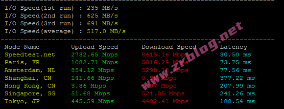 bench一键包磁盘IO和带宽信息,I/O均值大概在517MB/s的样子,套餐带宽1Gbps实测远超。