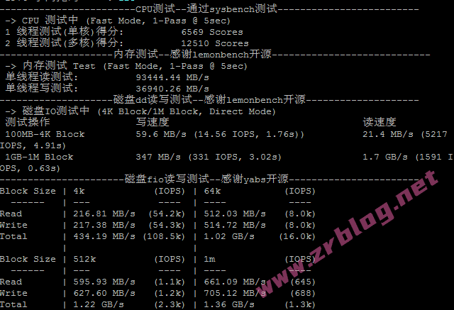 CPU跑分、内存和磁盘dd/fio读写测试结果: