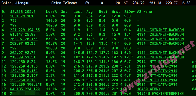 电信去程:出国直连圣何塞电信节点然后NTT到纽约机房