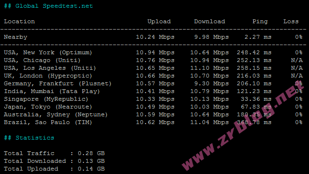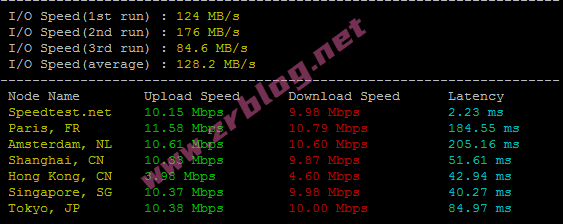 bench一键包磁盘IO和带宽信息,I/O大概在128MB/s,10M带宽也是与套餐一致。