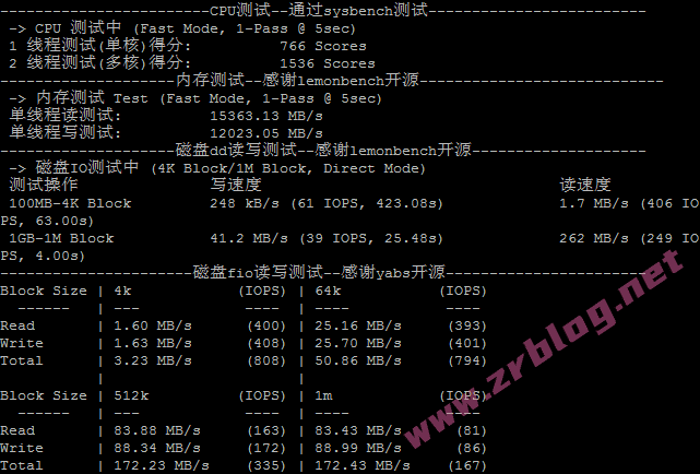 CPU跑分、内存和磁盘dd/fio读写测试结果: