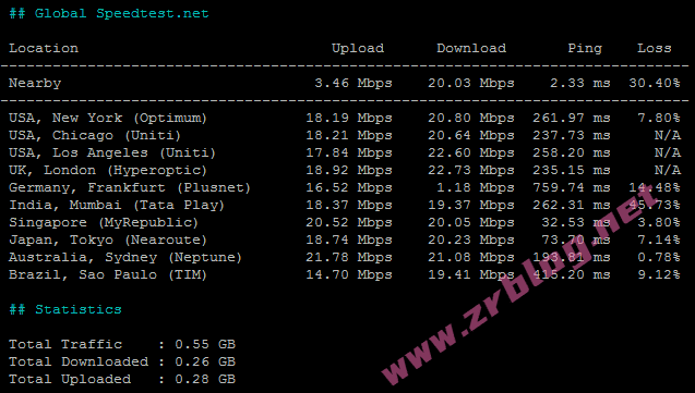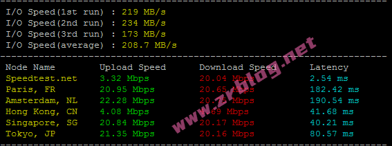 bench一键包磁盘IO和带宽信息,I/O大概在208MB/s,20M带宽也是与套餐一致。