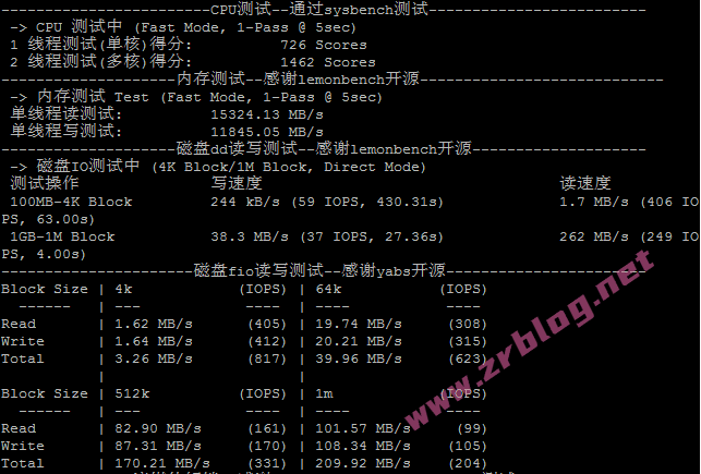 CPU跑分、内存和磁盘dd/fio读写测试结果: