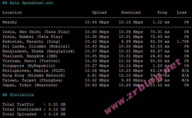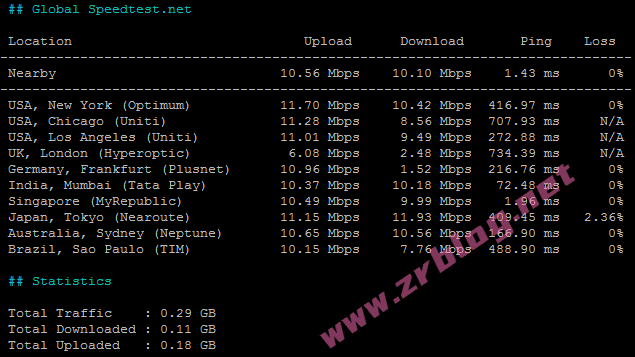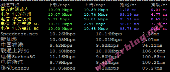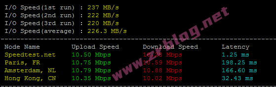 bench一键包磁盘IO和带宽信息,I/O大概在226MB/s,10M带宽很稳。