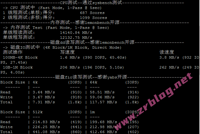 CPU跑分、内存和磁盘dd/fio读写测试结果: