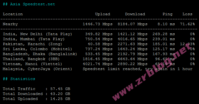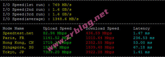 bench一键包磁盘IO和带宽信息,I/O大概在1348MB/s的样子,vultr所有节点IO性能和带宽都给足了的。