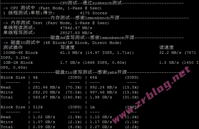 CPU跑分、内存和磁盘dd/fio读写测试结果: