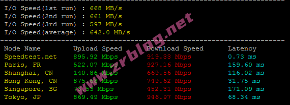 bench一键包磁盘IO和带宽信息,I/O大概在642MB/s的样子,带宽超过了商家说的最高500M。