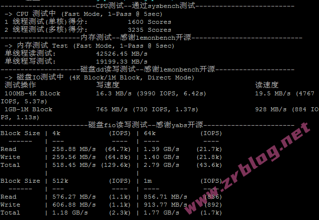 CPU跑分、内存和磁盘dd/fio读写测试结果: