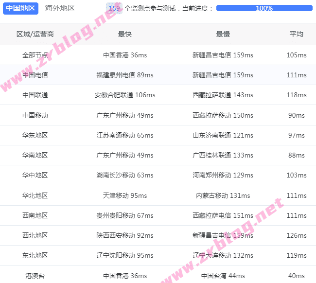 国内三网和港澳台ping测试,来自itdog一百多个节点:延迟较低