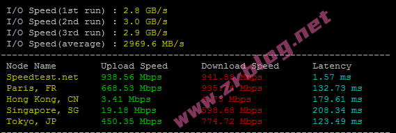 bench一键包磁盘IO和带宽信息,I/O大约在2.9GB/s,相当的强劲。