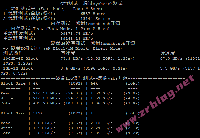 CPU跑分、内存和磁盘dd/fio读写测试结果: