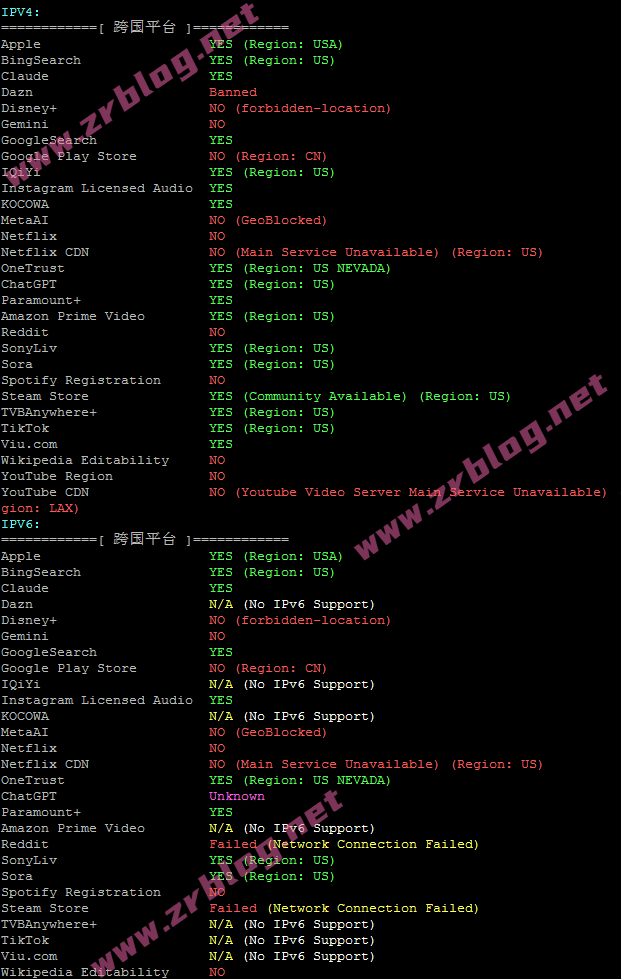更详细的流媒体解锁情况(IPv4和IPv6):