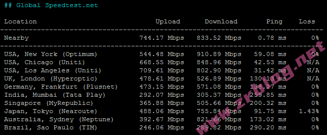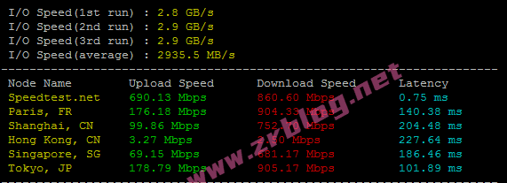 bench一键包磁盘IO和带宽信息,I/O大约在2.9GB/s,性能给力