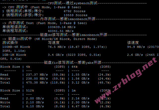CPU跑分、内存和磁盘dd/fio读写测试结果: