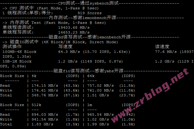 CPU跑分、内存和磁盘dd/fio读写测试结果: