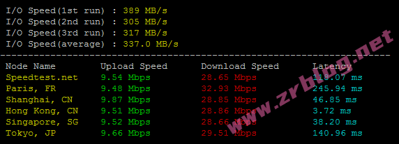 bench一键包磁盘IO和带宽信息,I/O大概在337MB/s的样子,带宽出网10M入网30M
