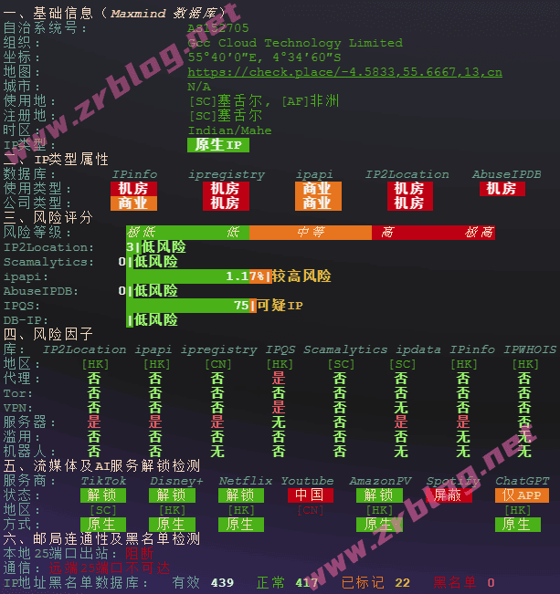 IP信息:广播IP,部分解锁(这个NQ脚本测试不准确,我用了几个在线网页检查都是广播IP,NQ脚本写的原生)