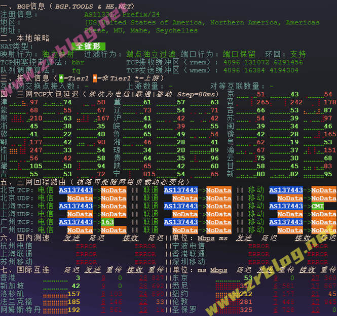 网络质量检测,也包括了三网回程路由情况: