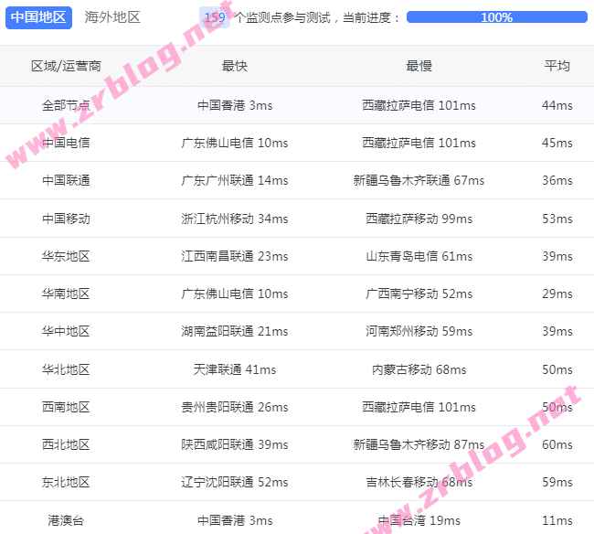 国内三网和港澳台ping测试,来自itdog一百多个节点: