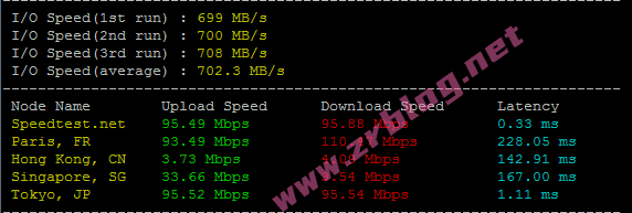 bench一键包磁盘IO和带宽信息:IO大概在702MB/s,100M端口基本跑满