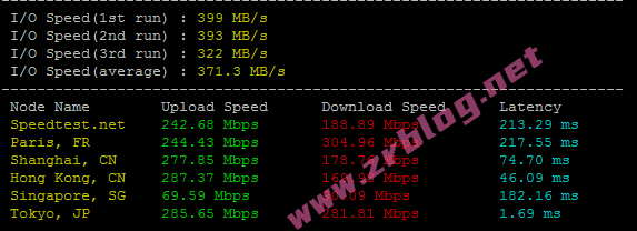 bench一键包磁盘IO和带宽信息,I/O平均值大概在371MB/s的样子