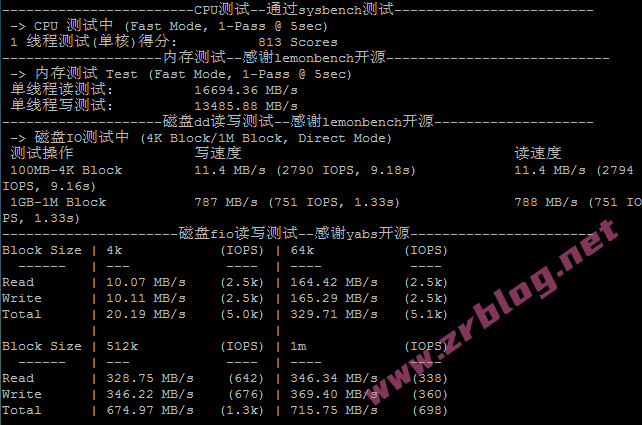 CPU跑分、内存和磁盘dd/fio读写测试结果: