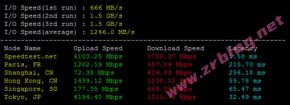 bench一键包磁盘IO和带宽信息,I/O大概在1246MB/s的样子,IO性能和带宽都很强。