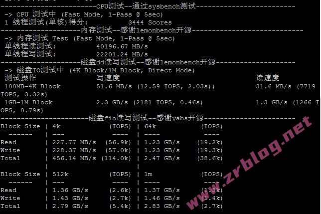 CPU跑分、内存和磁盘dd/fio读写测试结果: