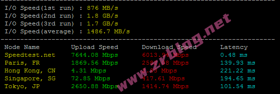 bench一键包磁盘IO和带宽信息,I/O大概在1486MB/s的样子,性能很强,带宽充足