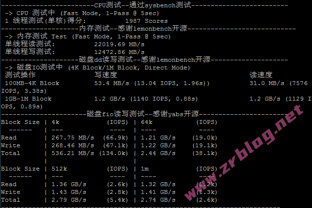 CPU跑分、内存和磁盘dd/fio读写测试结果: