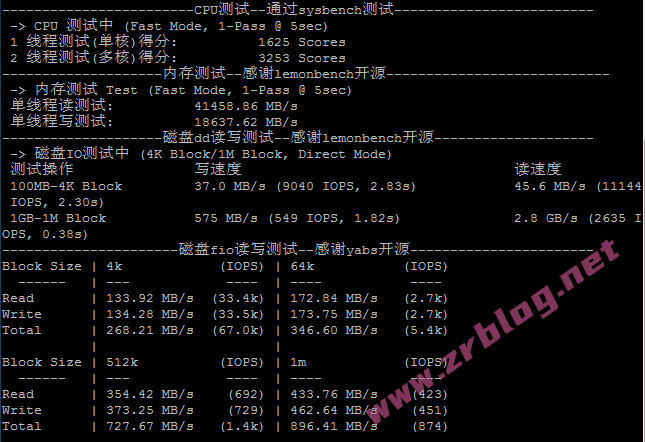CPU跑分、内存和磁盘dd/fio读写测试结果: