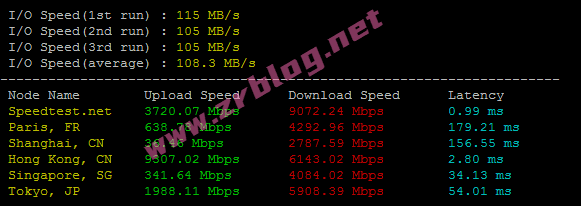 bench一键包磁盘IO和带宽信息,I/O下单过程中可以看到限制100MiB/s,实测在108MB/s左右