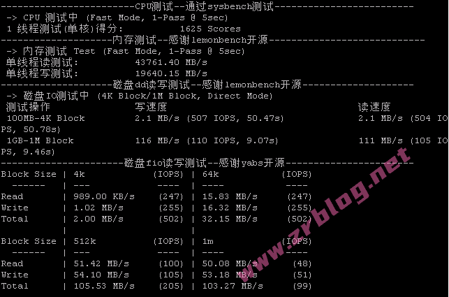 CPU跑分、内存和磁盘dd/fio读写测试结果: