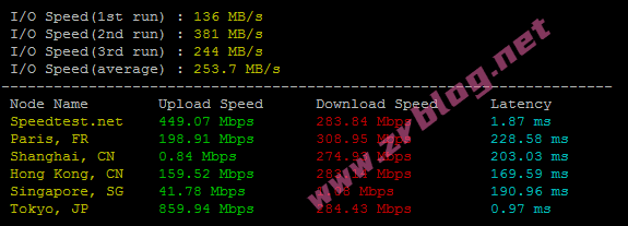 bench一键包磁盘IO和带宽信息:I/O大概在253MB/s的样子