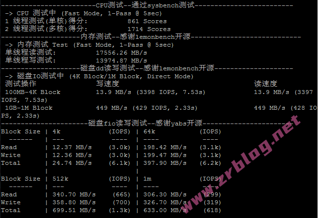 CPU跑分、内存和磁盘dd/fio读写测试结果: