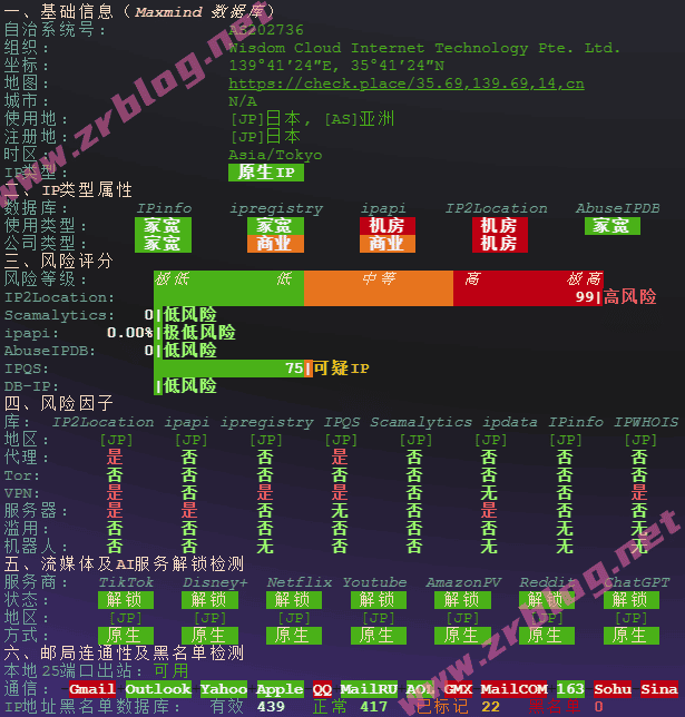 IP信息:日本原生IP,解锁全绿,部分数据库判定为家宽