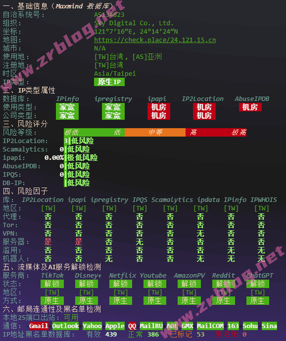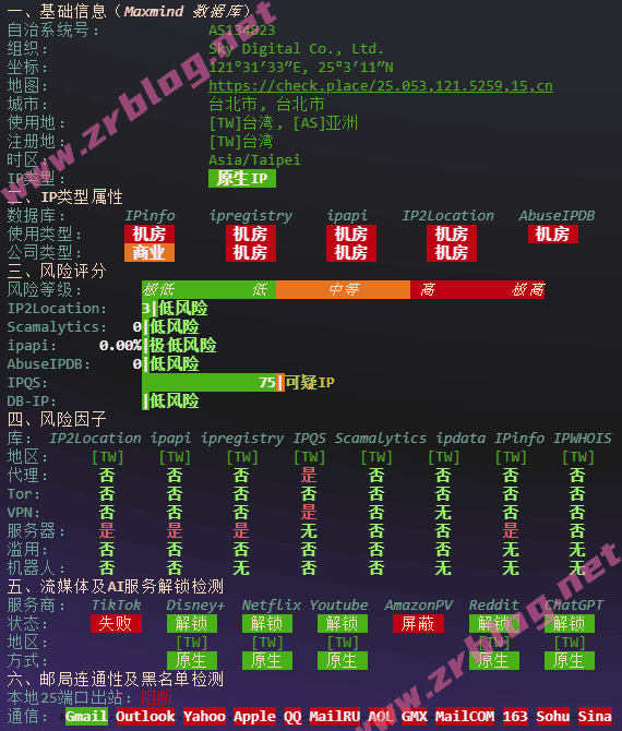 IPv4信息:台湾原生IP,解锁全绿