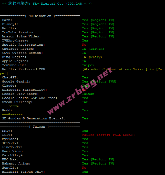 IPv6信息:台湾原生IP,部分解锁,效果不如IPv4