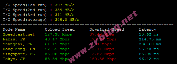 bench一键包磁盘IO和带宽信息:I/O大概在349MB/s的样子