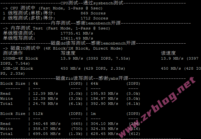 CPU跑分、内存和磁盘dd/fio读写测试结果: