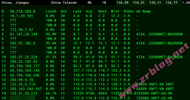 北京 电信 VNPT -> 163 地理路径:越南 -> 香港 -> 北京 自治系统路径:AS135905 -> AS45899 -> AS23764 -> AS4134 -> AS4847 2 0.45ms 123.31.*.* AS135905 [VNPT-VN] 越南 河内市 VIETNAM POSTS AND TELECOMMUNICATIONS GROUP 3 1.47ms 123.29.*.* AS45899 [VNPT-VN] 越南 河内 河内市 vnpt.vn 4 28.95ms 113.171.*.* AS45899 [VNPT-VN] 越南 岘港市 vnpt.vn 7-8 41.28ms 113.171.*.* AS45899 [VNPT-VN] 中国 香港 vnpt.vn 9 54.71ms 69.194.*.* * 中国 香港 10-11 49.77ms 69.194.*.* AS23764 * 中国 香港 电信/CTGNet 12-14 137.92ms 202.97.*.* AS4134 [CHINANET-BB] 中国 北京 X-I chinatelecom.com.cn 电信 16-18 140.57ms 219.141.*.* AS4847 [CHINATELECOM-BJ] 中国 北京 bj.189.cn 19 143.64ms 106.37.*.* AS4847 [CHINANET-HN] 中国 北京 bj.189.cn 上海 电信 VNPT -> 163 地理路径:越南 -> 香港 -> 上海 自治系统路径:AS135905 -> AS45899 -> AS23764 -> AS4134 -> AS4812 2 0.80ms 123.31.*.* AS135905 [VNPT-VN] 越南 河内市 VIETNAM POSTS AND TELECOMMUNICATIONS GROUP 3 0.82ms 113.171.*.* AS45899 [VNPT-VN] 越南 河内 河内市 vnpt.vn 4 29.13ms 113.171.*.* AS45899 [VNPT-VN] 越南 岘港市 vnpt.vn 8 41.63ms 113.171.*.* AS45899 [VNPT-VN] 中国 香港 vnpt.vn 9-10 46.63ms 69.194.*.* AS23764 * 中国 香港 电信/CTGNet 11 99.98ms 203.22.*.* AS23764 [CTG-CN] * 中国 香港 163-CTG CTGNet 12-15 121.67ms 202.97.*.* AS4134 [CHINANET-BB] 中国 上海 chinatelecom.com.cn 21 126.02ms 101.226.*.* AS4812 [CHINANET-SH] 中国 上海市 chinatelecom.cn 电信 广东 电信 VNPT -> 163 地理路径:越南 -> 香港 -> 广东 自治系统路径:AS135905 -> AS45899 -> AS23764 -> AS4134 2 0.55ms 123.31.*.* AS135905 [VNPT-VN] 越南 河内市 VIETNAM POSTS AND TELECOMMUNICATIONS GROUP 3 0.71ms 222.255.*.* AS45899 [VDC-NET] 越南 河内市 vnpt.vn 4-5 24.55ms 113.171.*.* AS45899 [VNPT-VN] 越南 河内市 vnpt.vn 6-7 13.16ms 113.171.*.* AS45899 [VNPT-VN] 越南 岘港市 C-I vnpt.vn 8-9 53.90ms 203.99.*.* * 中国 香港 电信 10 47.28ms 69.194.*.* AS23764 * 中国 香港 电信/CTGNet 11-14 90.10ms 202.97.*.* AS4134 [CHINANET-BB] 中国 广东 广州 chinatelecom.com.cn 15-17 97.89ms 113.96.*.* AS4134 [CHINANET-GD] 中国 广东 广州 chinatelecom.com.cn 电信 20 100.64ms 183.47.*.* AS4134 [APNIC-AP] 中国 广东省 广州市 chinatelecom.com.cn 电信