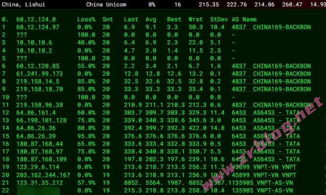 北京联通回程VNPT先到香港然后转美国洛杉矶经COGENT走联通圣何塞节点回国,上海/广东联通则是出机房走VNPT到香港转CTGNet回国