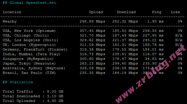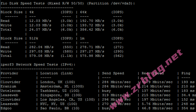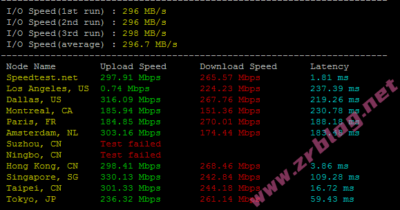 bench一键包磁盘IO和带宽信息:I/O大概在296MB/s的样子